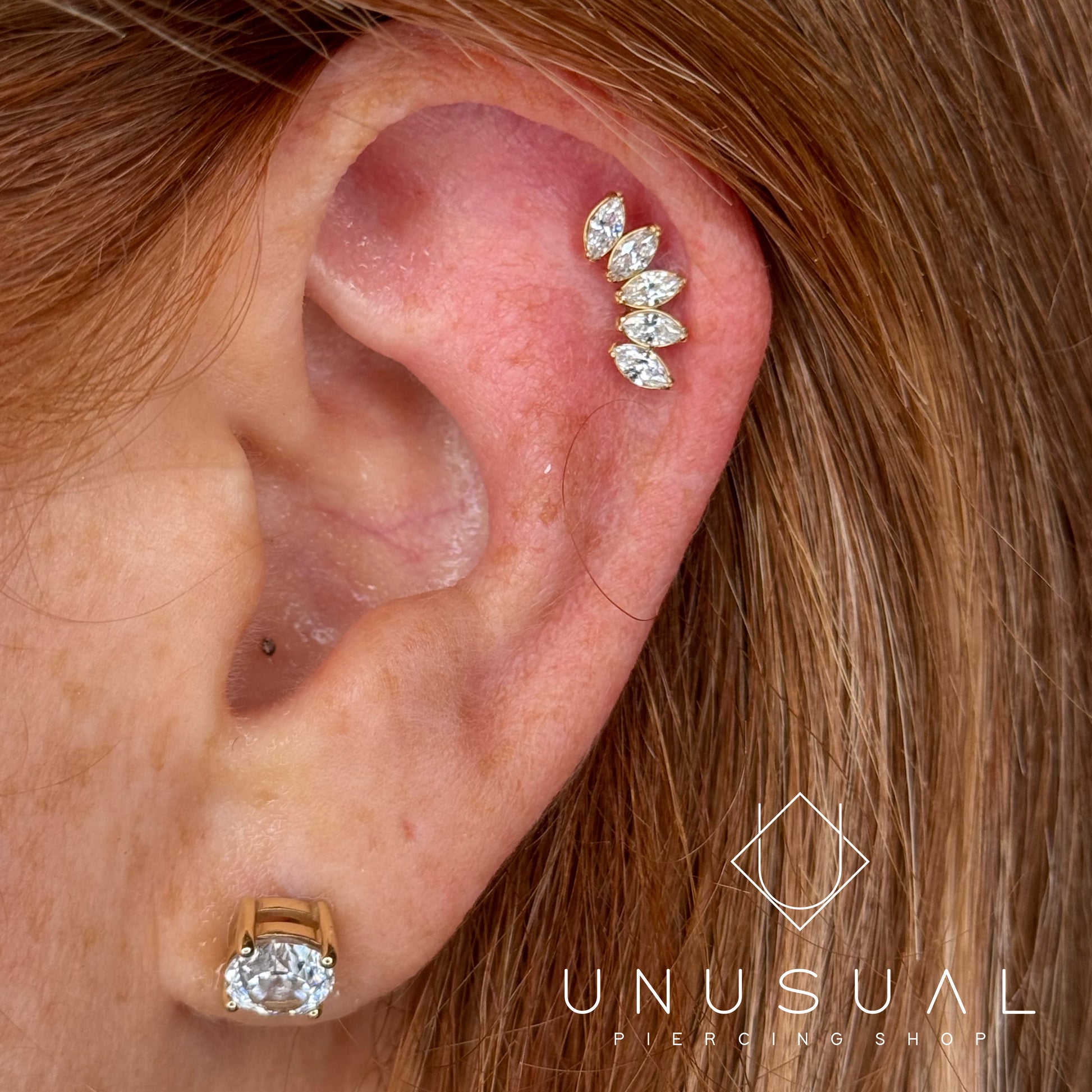 Il Big Marquise Piercing in titanio è adatto per fori alla cartilagine, come nel caso dell'Helix Piercing o conch Piercing. E' montato su un labret molto comodo vista la piastrina piatta nel retro. Perfetto per chi ama un gioiello vistoso che faccia brillare l'orecchio.