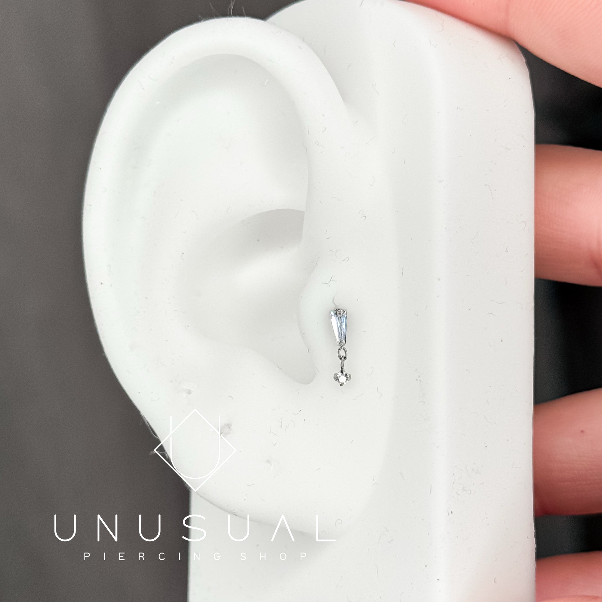 Il Dangling Baguette è adatto per quasi tutti i fori alla cartilagine date le sue piccole dimensioni, come il trago piercing, forward helix piercing, helix, il lobo o flat piercing. E' montato su un labret molto comodo vista la piastrina piatta nel retro. Perfetto per chi ama un gioiello vistoso che faccia brillare l'orecchio. L'eleganza è assicurata.