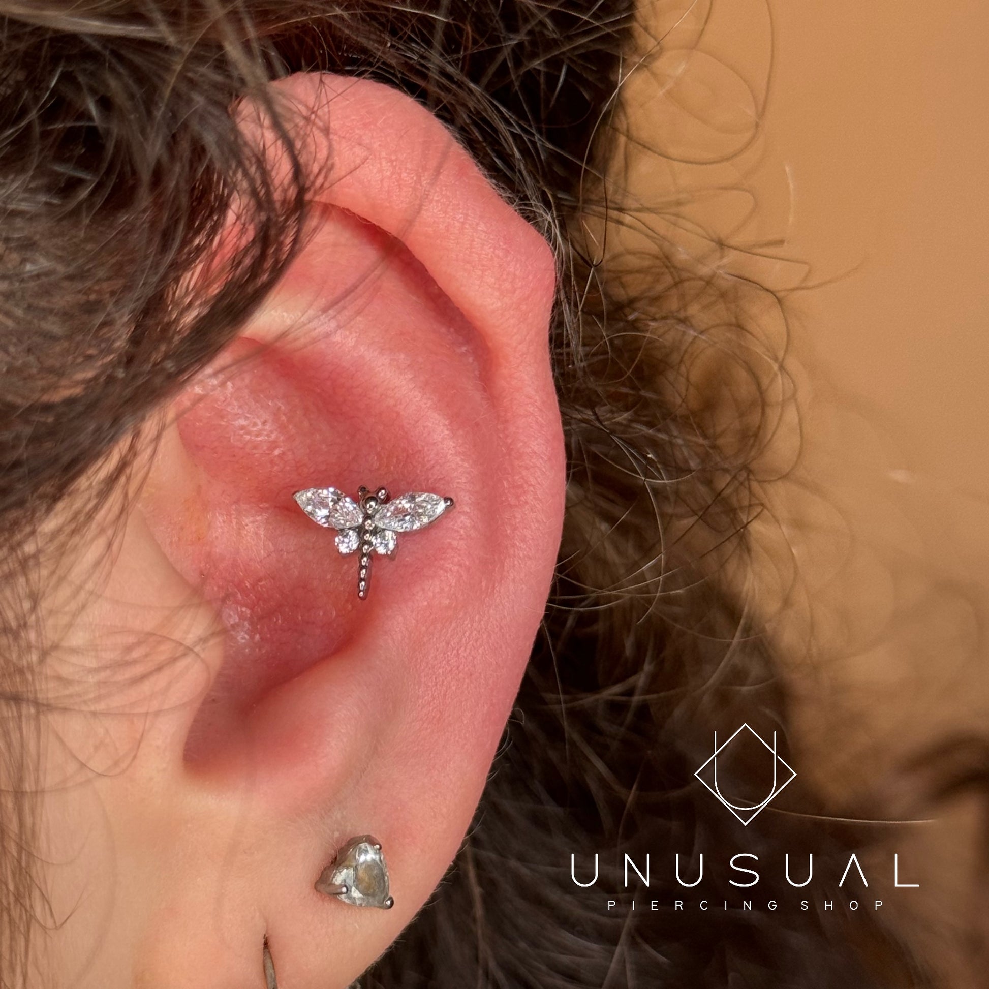Il gioiello Dragonfly piercing in titanio è adatto per fori alla cartilagine, come il flat piercing, conch piercing ma anche il lobo. E' montato su un labret molto comodo vista la piastrina piatta nel retro. Perfetto per chi non ama un gioiello vistoso e preferisce un punto luce che brilla senza avere alcun tipo di zircone. L'eleganza è assicurata.
