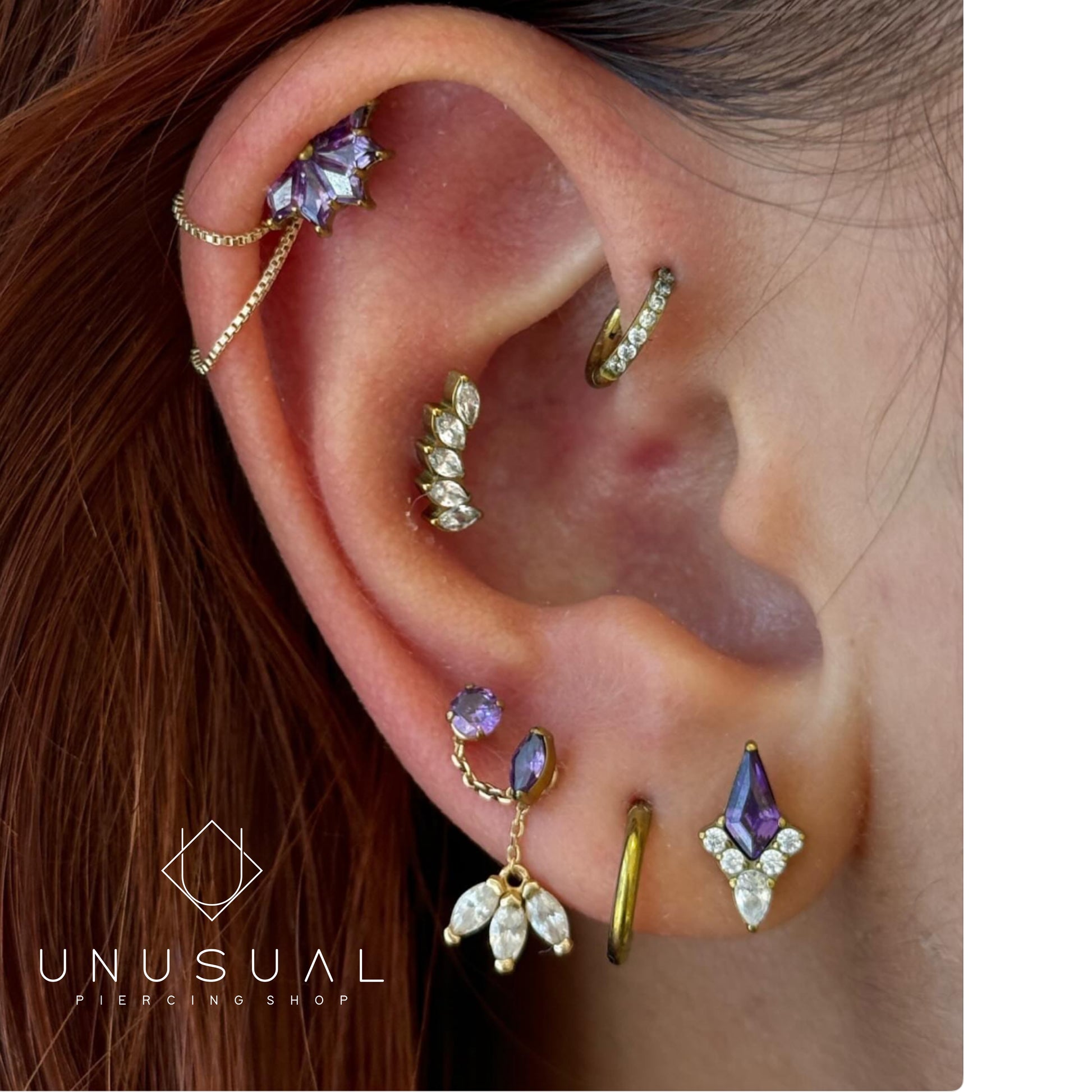 La particolarità di questo gioiello è che permette di unire due fori con una finissima catena in oro 18kt e un pendente marquise, sempre in oro 18kt. Il gioiello comprende anche due Swarovski con barra in titanio e permette di riempire l'orecchio, dargli luce e un tocco di stile che non si può di certo ignorare.