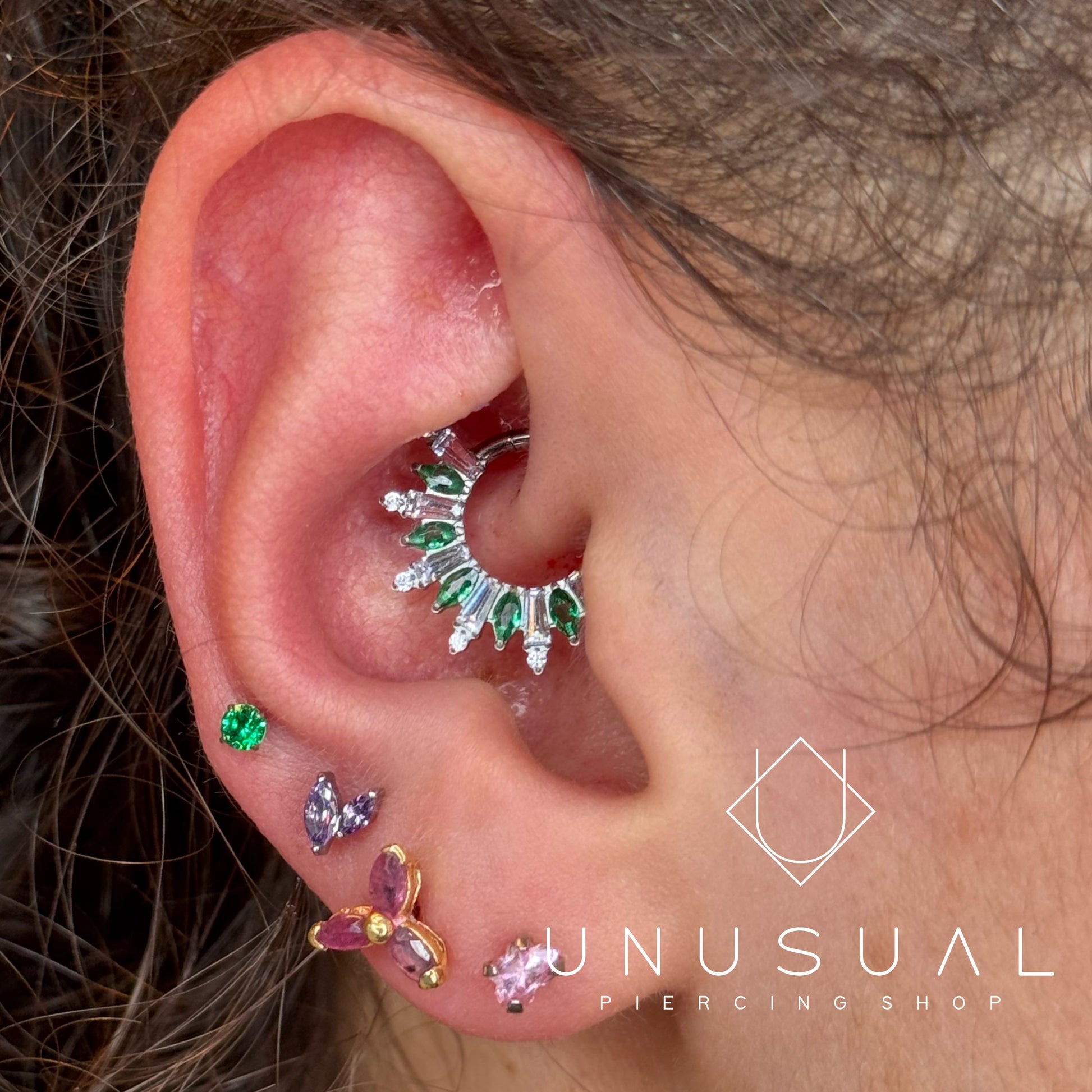 Il Venere Daith Piercing titanio è il gioiello perfetto per il daith piercing che grazie al fato che sia tempestato di brillanti verdi o viola o azzurri mischiati a una piccola fila di brillanti bianchi più interna, rende unico l'effetto che da. È pensato per chi non ama il classico gioiello a ferro di cavallo e per chi vuole sfoggiare la propria personalità.
